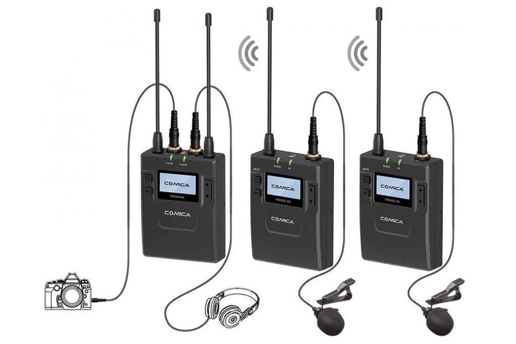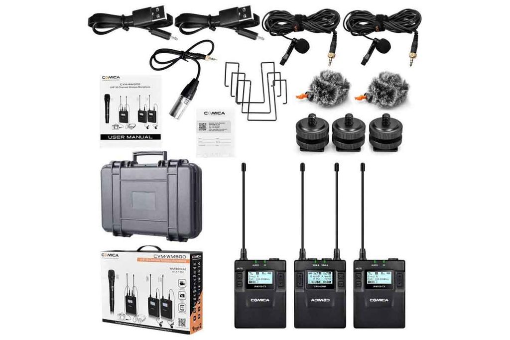 - Два передатчика оснащённые всенаправленными петличными микрофонами с ветрозащитой