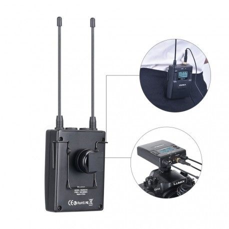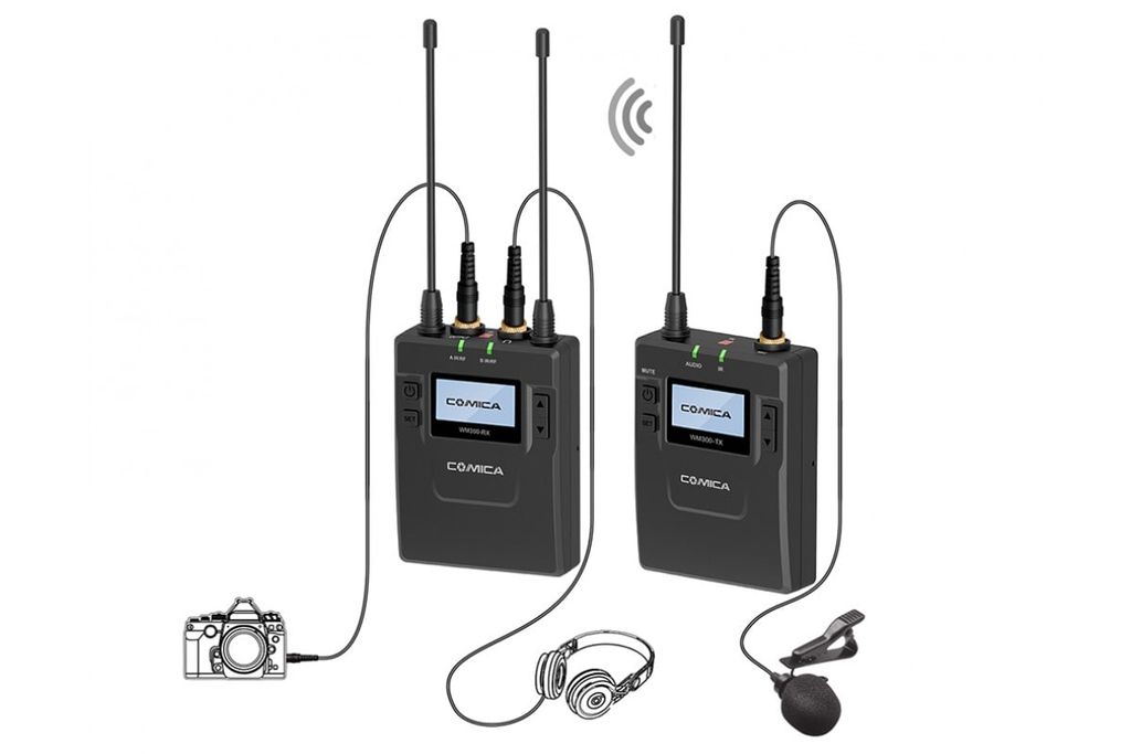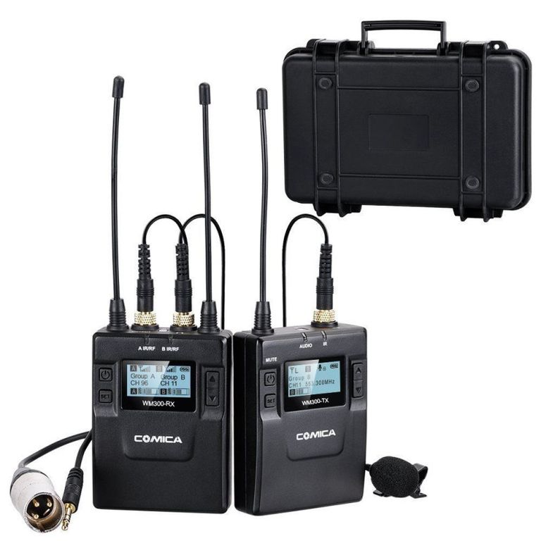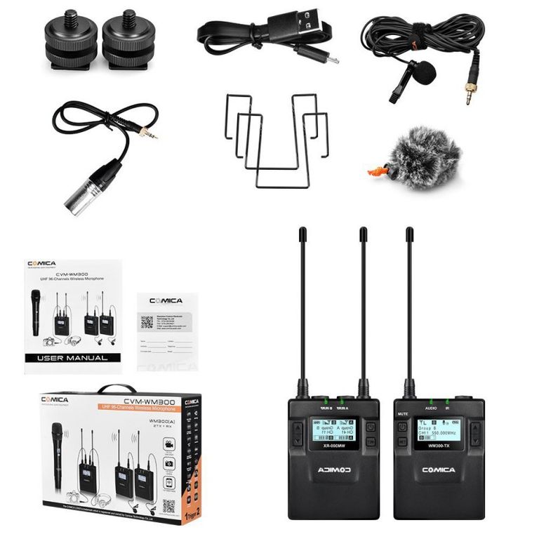 - Один передатчик, оснащённый всенаправленным петличным микрофонам с ветрозащитой