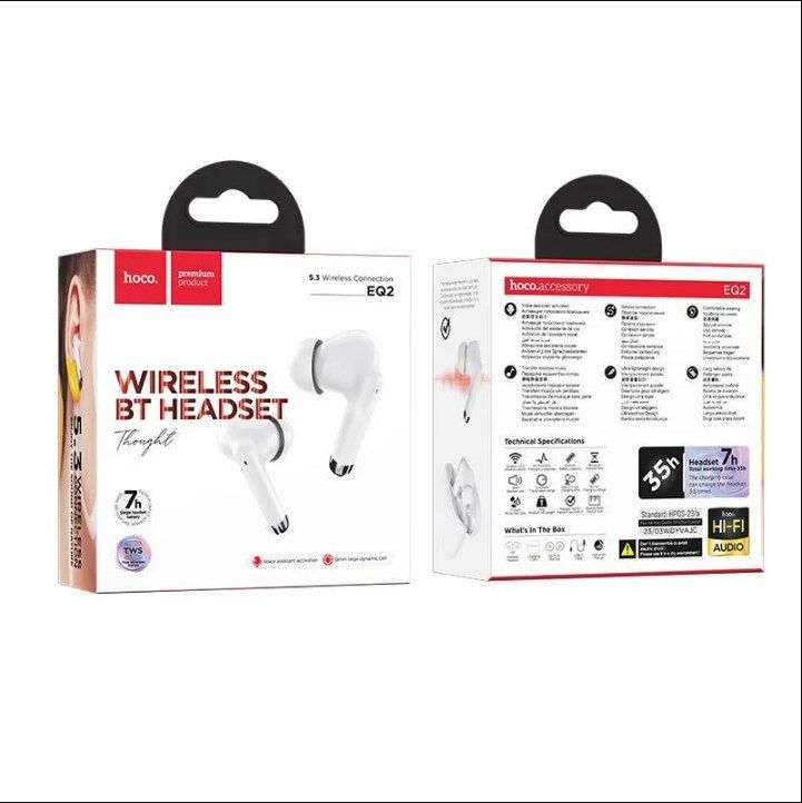 Hoco EQ2- это современные беспроводные наушники, которые предоставляют комфортное и удобное прослушивание музыки и подкастов без необходимости использования проводов. Наушники имеют стильный и эргономичный дизайн, который позволяет их носить в течение длительного времени без дискомфорта.